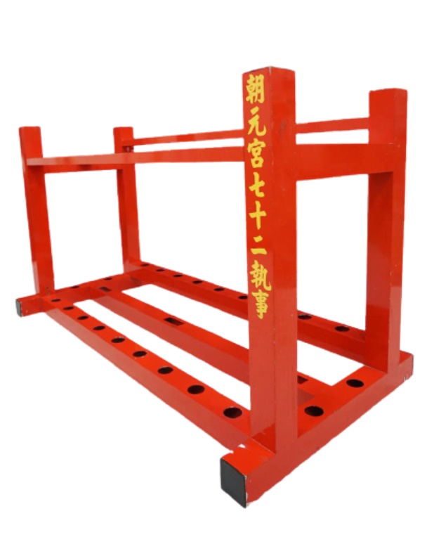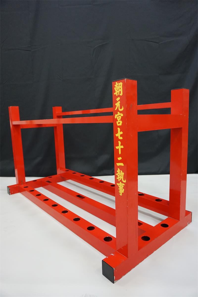 廟宇專用置物架,架上有開孔以利執事牌放置,亦可做旗隊收納架,此組設計使底部較為穩固,不易傾倒。可客製化。